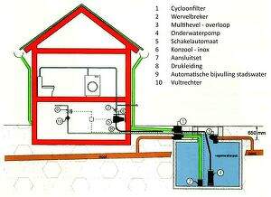 Het regenwater loopt van het dak, via de dakgoot door de afvoerpijp naar de opslagtank van het regenwater. De inhoud van de opslagtank is afhankelijk van de aardoppervlakte en de gemeentelijke voorschriften.